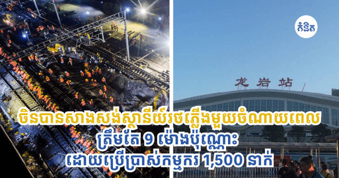 ថ្មីៗនេះ ប្រទេសចិនបានបញ្ចប់គម្រោងផ្លូវដែកដ៏ធំមួយក្នុងរយៈពេលត្រឹមតែ 9 ម៉ោងប៉ុណ្ណោះ ដោយប្រើកម្មករប្រហែល 1,500 នាក់ជាមួយម៉ាស៊ីនជាច្រើន ហើយបានធ្វើការរួមគ្នាតាមផែនការបានយ៉ាងត្រឹមត្រូវ ដើម្បីឱ្យការងារសម្រេចបានលឿន និងរលូន។ នេះបានកើតឡើងនៅស្ថានីយ៍រថភ្លើងឡុងយ៉ានក្នុងទីក្រុង Longyan នៃប្រទេសចិន។