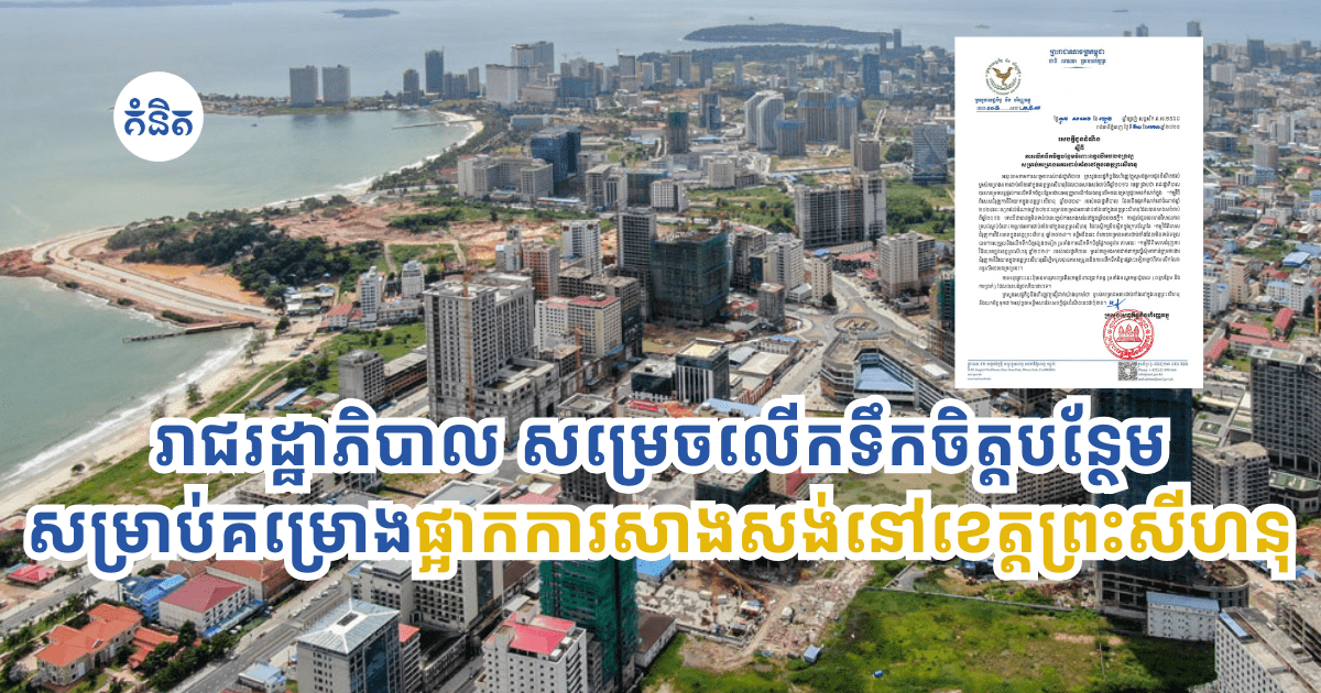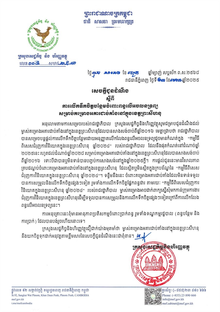 ក្រសួងសេដ្ឋកិច្ចនិងហិរញ្ញវត្ថុ៖ បានចេញលិខិតជម្រាបជូនដំណឹងដល់ ម្ចាស់គម្រោងអគារជាប់គាំងនៅក្នុងខេត្តព្រះសីហនុដែលបានសាងសង់ចាប់ពីឆ្នាំ២០១៦ មេត្តាជ្រាបថា រាជរដ្ឋាភិបាល បានសម្រេចបន្តផ្តល់ការលើកទឹកចិត្តបន្ថែមដោយអនុញ្ញាតលើកលែងពន្ធលើអចលនទ្រព្យដូចមានកំណត់ក្នុង “កម្មវិធី ពិសេសជំរុញការវិនិយោគក្នុងខេត្តព្រះសីហនុ ឆ្នាំ២០២៤” របស់រាជរដ្ឋាភិបាល ដែលនឹងផុតកំណត់នៅដំណាច់ឆ្នាំ ២០២៥នេះ រហូតដល់ដំណាច់ឆ្នាំ២០២៨ សម្រាប់គម្រោងអគារជាប់គាំងនៅក្នុងខេត្តព្រះសីហនុដែលបានសាងសង់ចាប់ ពីឆ្នាំ២០១៦ ទោះបីជាបានឬមិនទាន់បានបញ្ចប់ការសាងសង់នៅក្នុងឆ្នាំ២០២៥ក្តី។