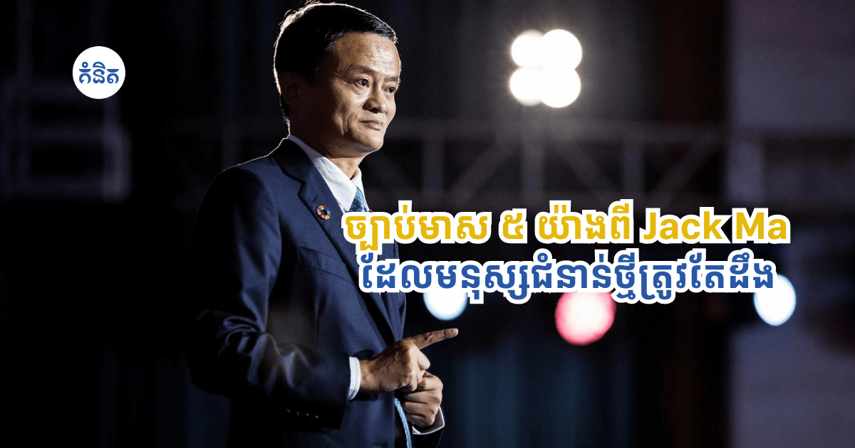 លោក Jack Ma ដែលជាស្ថាបនិកក្រុមហ៊ុន Alibaba មិនមែនកើតមកជាសេដ្ឋី ឬជាអ្នកជំនួញដែលមានទេពកោសល្យពីកំណើតនោះទេ។ គាត់គឺជាអតីតគ្រូបង្រៀនភាសាអង់គ្លេសម្នាក់ ដែលធ្លាប់បរាជ័យរាប់មិនអស់។ ដំណើរជីវិតរបស់គាត់គឺជាមេរៀនដ៏ល្អបំផុតសម្រាប់អ្នកដែលកំពុងតស៊ូក្នុងជីវិត។ ខាងក្រោមនេះគឺជាមេរៀនជីវិតទាំង ៥ យ៉ាងដ៏មានតម្លៃពីលោក Jack Ma៖