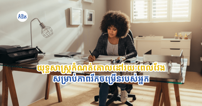 - ប្រើប្រាស់គោលដៅ SMART: កំណត់គោលដៅរបស់អ្នកឱ្យមានលក្ខណៈ ជាក់លាក់ អាចវាស់វែងបាន អាចសម្រេចបាន ពាក់ព័ន្ធ និងមានពេលវេលាកំណត់។