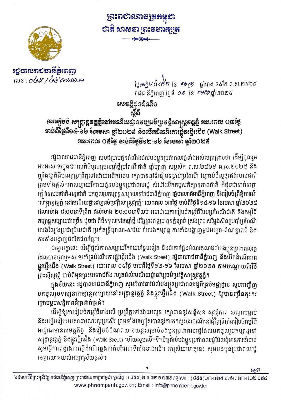 ជាមួយគ្នានេះ ដើម្បីផ្តល់ភាពសប្បាយរីករាយបន្ថែមទៀត រដ្ឋបាលរាជធានីភ្នំពេញ នឹងបើកដំណើរការ ផ្លូវថ្មើរជើង (Walk Street) រយៈពេល ០៥ថ្ងៃ ចាប់ពីថ្ងៃទី១២-១៦ ខែមេសា ឆ្នាំ២០២៥ តាមបណ្តោយតីរវិថី ព្រះស៊ីសុវត្ថិ ចាប់ពីមុខព្រះបរមរាជវាំង រហូតដល់រមណីយដ្ឋានវប្បធម៌ប្រវត្តិសាស្ត្រវត្តភ្នំ។ ដើម្បីឱ្យបងប្អូនប្រជាពលរដ្ឋមកចូលរួមទស្សនាកម្សាន្តសប្បាយនៅសង្ក្រាន្តវត្តភ្នំ និងផ្លូវថ្មើរជើង (Walk Street) ឱ្យបានច្រើនកុះករ ក្រោមម្លប់សន្តិភាពដ៏ត្រជាក់ត្រជំ។