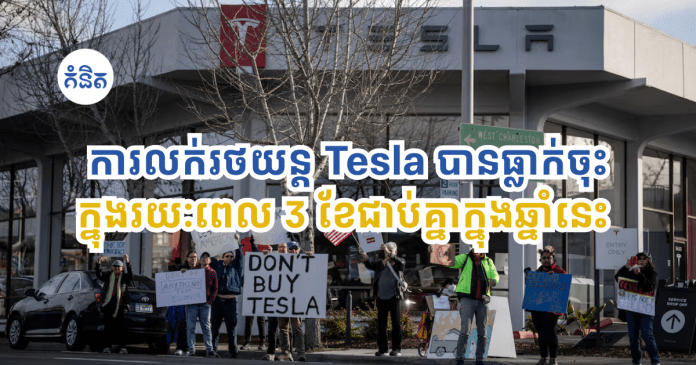 ការធ្លាក់ចុះនេះដោយសារមានការកើនឡើងនូវប្រតិកម្មប្រឆាំងនឹងលោក Elon Musk ដែលជាceo នៃក្រុមហ៊ុនTesla ក្នុងសកម្មភាពការចូលរួមរបស់លោកនៅក្នុងរដ្ឋបាល Trump ដោយអ្នកប្រឆាំងទាំងនោះបានធ្វើការបំផ្លិចបំផ្លាញរថយន្ត Tesla គ្រប់រូបភាព និងមានការកើនឡើងការប្រកួតប្រជែងនៅក្នុងទីផ្សាររថយន្តអគ្គិសនី (EV) ។